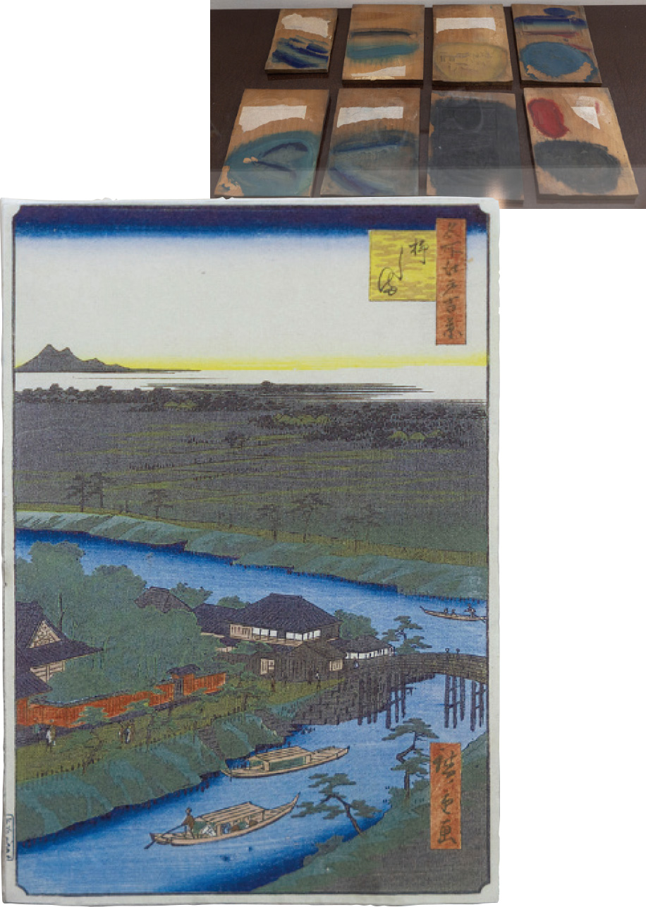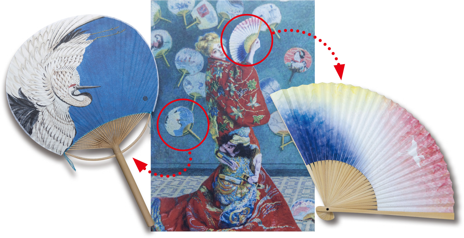 - クロード・モネ作の『ラ・ジャポネーズ』の中で、背景に飾られている団扇の中に、当店が版元として制作していたものもあったと思われます。その一部を復刻し、販売しています。この絵が描かれた明治9(1876)年ごろは、フランスで大流行していたジャポニスムの影響もあり、多くの団扇や浮世絵がフランスに輸出され、その中に伊場仙のものもあったと思われます。当店は江戸後期から豊国、国芳、広重など人気絵師の版元でしたので、浮世絵を団扇に刷り込んで販売し、人気を博しました。今は浮世絵だけでなく、江戸の粋な遊びの「判じ物」の絵柄や、和紙に江戸の伝統色を染料で染め、扇面には熟練した職人の手描きで細い線を施した「しけびき」という扇子も充実しています。