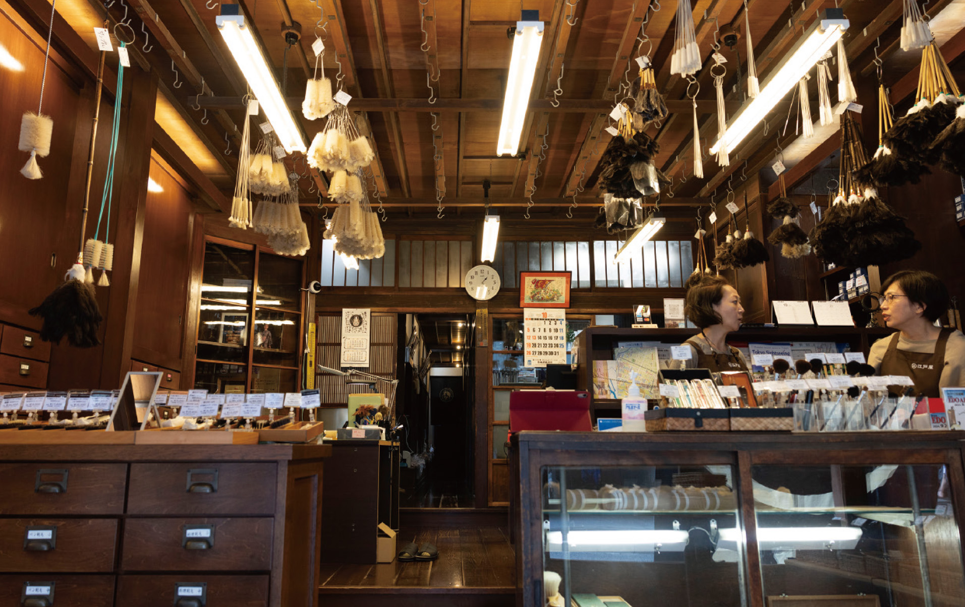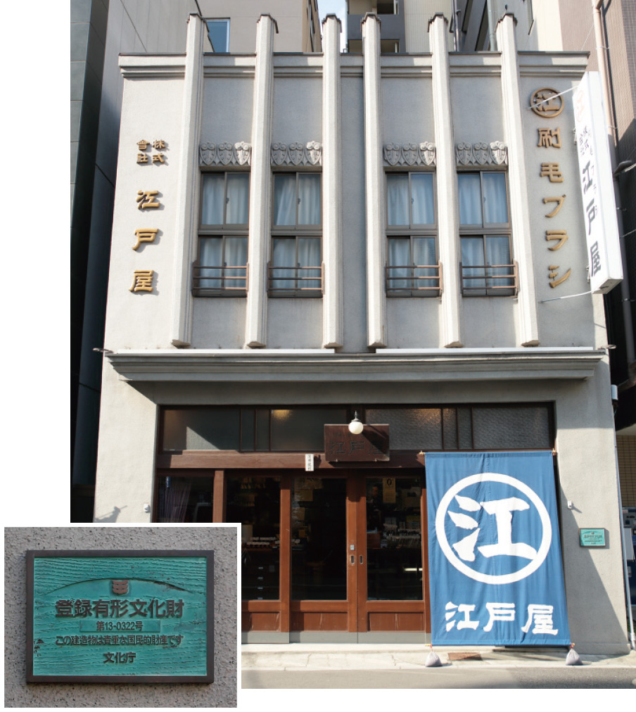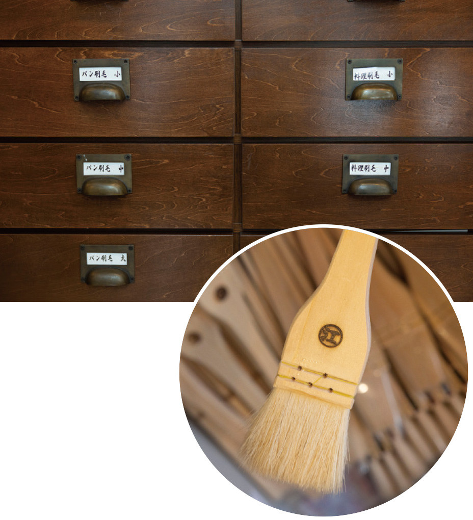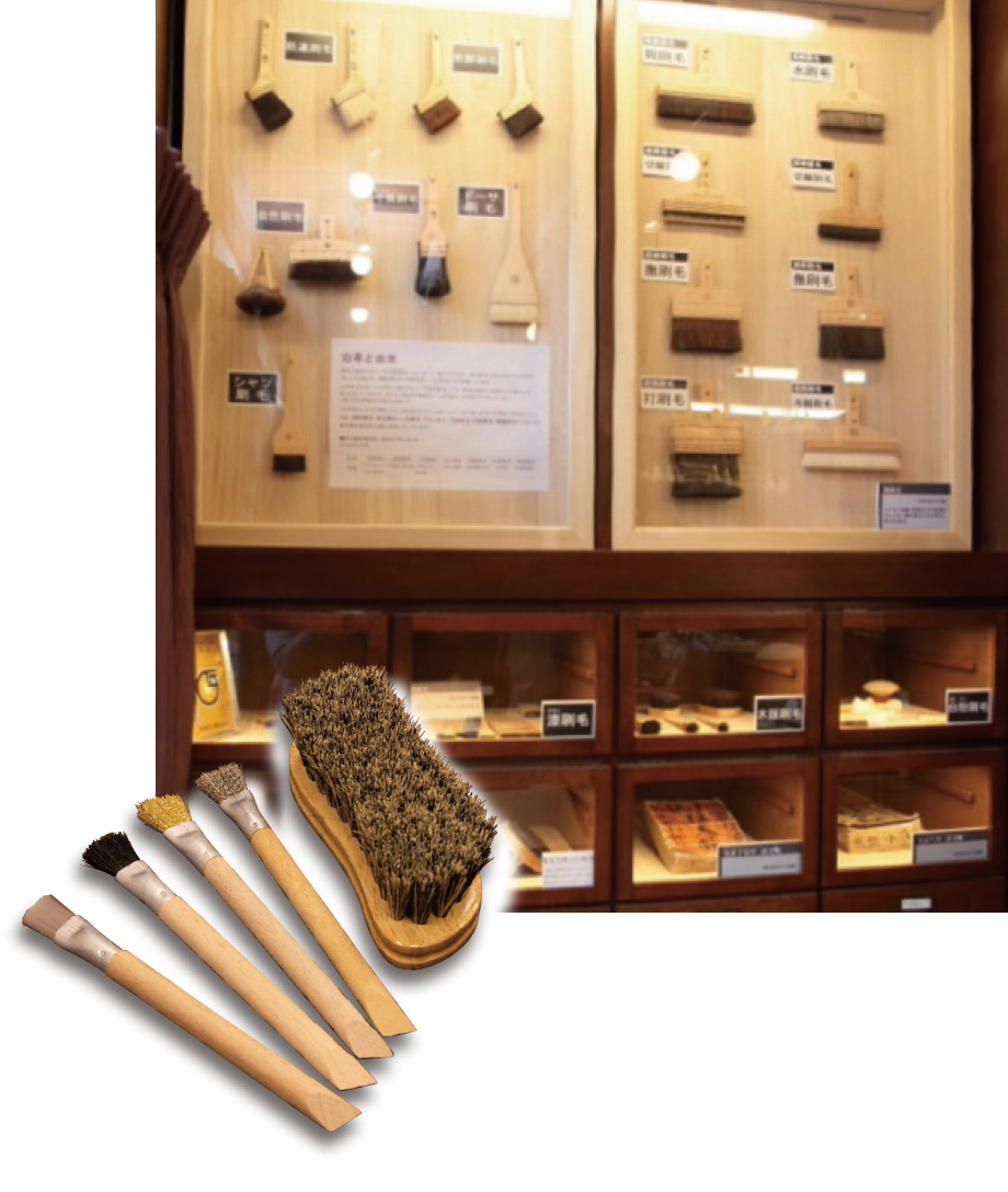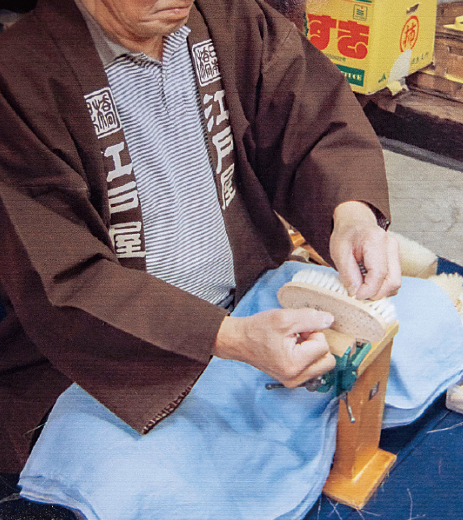 - 当家の初代、利兵衛は刷毛づくりの本場、京都で修行を積んだ腕の良い職人で、大奥でも化粧刷毛が愛用されるなど人気を博していました。それで享保3(1718)年に将軍家から「江戸屋」の屋号を与えられ、刷毛の専門店として店を構えたのがはじまりなんです。ブラシは、幕末にお台場にあった大砲の掃除用につくったのが最初です。創業から300年余、変わらずに江戸刷毛とブラシをつくり続けてきました。しかし近年では、カメラ用のクリーニングブラシなど、精密機器の洗浄用にウチの商品が使われるようになり、大きな比重を占めるまでになりました。江戸時代から続く職人の技術が、現代の最先端でも重要な役を担っているんです。