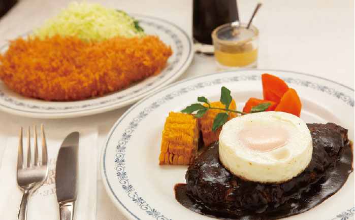 人気メニュー「元祖ポークカツレツ」と「ハンバーグステーキ」。シンプルだけれどもしっかりとした味わいでライスとの相性も抜群。店内は昔ながらの変わらぬ味を求める常連客とガイドブックを手にやってくる外国からの旅行者とで賑わう。