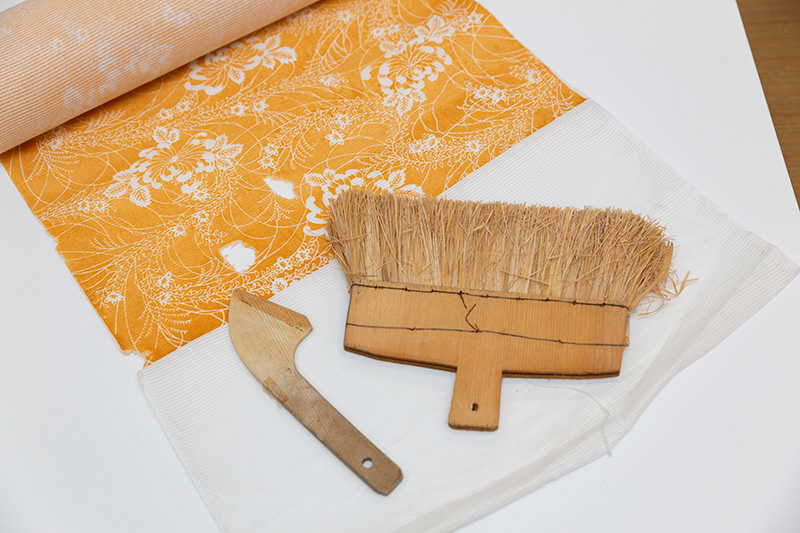 ゆかたの本場は東京で、とくに中央区日本橋界隈は繊維問屋街として発展してきました。中でも「三勝」は、化学染料や新しい染色技法など、合理的に着物をつくることが流行した時代にも妥協せず、すべて手作業による昔ながらの染色技法にこだわり続けてきました。そのものづくりを牽引してきたのが、専属の染職人だった清水幸太郎さんでした。彼は卓抜した技術から昭和30年(1955年)に重要無形文化財に指定されました。その技法とは、江戸時代から伝わる「長板中形(ながいたちゅうがた)」というものです。